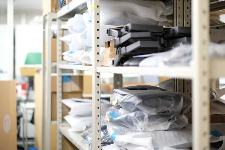 メンテナンスセンターには、棚一面にアーロンチェアの純正パーツが並んでいます。 旧型(クラシック)から現行のリマスタードモデルまで、サイズ(A・B・C)やカラー(グラファイト/カーボン/ミネラル)ごとに年代を問わず最適な修理が行える体制が整っています。